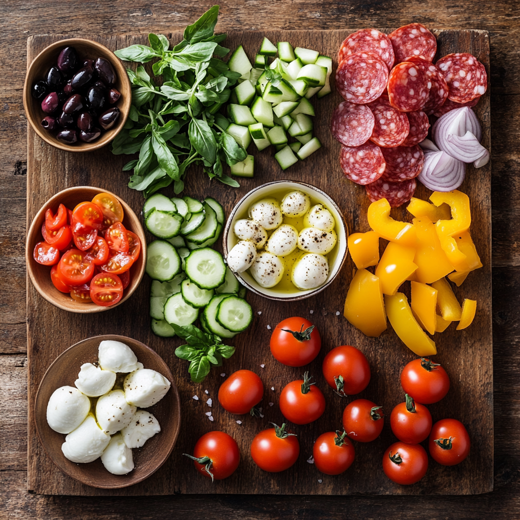 In a large mixing bowl, combine all your chopped vegetables, meats, cheeses, and olives. Give yourself a moment to bask in the colorful mosaic you’re creating—a true masterpiece!