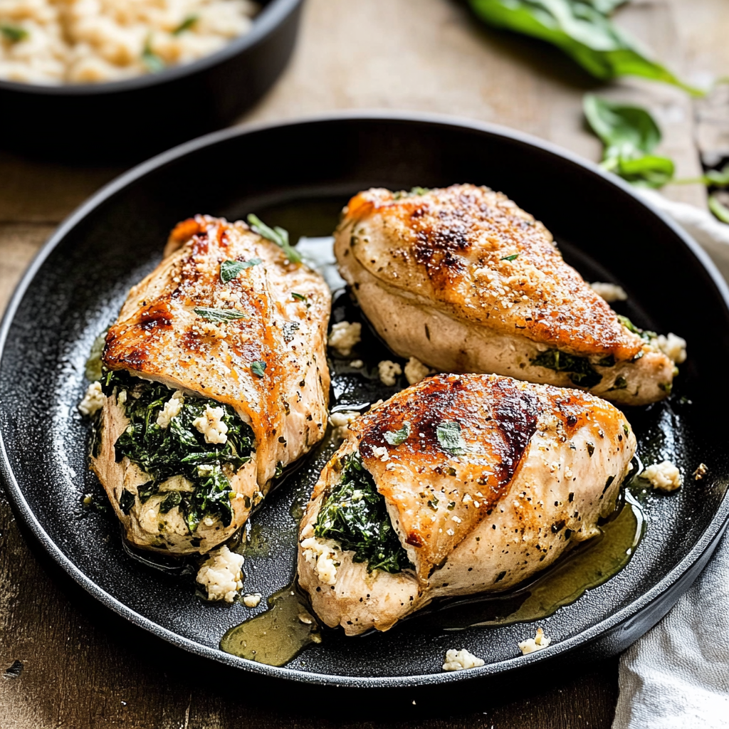 In summary, Spinach Stuffed Chicken is not just a delightful dish; it’s also versatile and nutritious. Its combination of tender chicken filled with creamy spinach creates an irresistible meal perfect for various occasions. Whether you choose to serve it alongside roasted vegetables or a refreshing salad, this dish promises satisfaction every time. Try making Spinach Stuffed Chicken tonight for a flavorful dinner that will surely impress your family or guests!